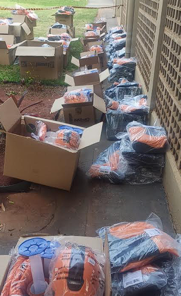 Os kits foram compostos pelos seguintes materiais: 2 (dois) pluviômetros manuais; 5 (cinco) rolos de 200 metros de fita zebrada; 1 (um) rolo de 100 metros de lona plástica; 2 (duas) jardineiras impermeáveis com botas; 5 (cinco) coletes operacionais; 5 (cinco) bonés operacionais; 5 (cinco) capas de chuva; 5 (cinco) luvas de raspa; 5 (cinco) botas PVC e 5 (cinco) capacetes.